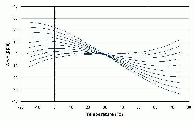 The resonant frequency of oscillating crystals generally depends on the temperature of the quartz. The temperature characteristics of AT- and SC-cuts crystals are described by a 3rd order parabola.